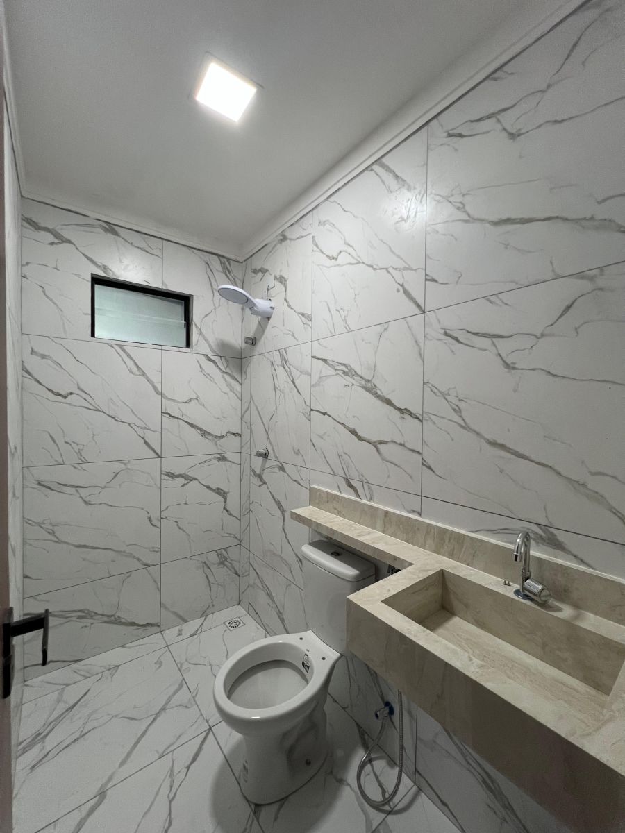 • Banheiro com bancada esculpida e chuveiro elétrico